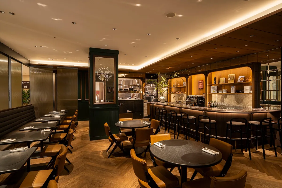 サロンの空間は、アラン・デュカスの哲学を反映した設計となっており、クラシックとモダンの調和が取れています。天然木や天然石を使用し、スチールの質感が加わり、ダークグリーンとゴールドのアクセントが心地よく感じられます。メインダイニングのほかにカウンター席や個室も整備されており、さまざまなシーンで利用できる空間が確保されています。