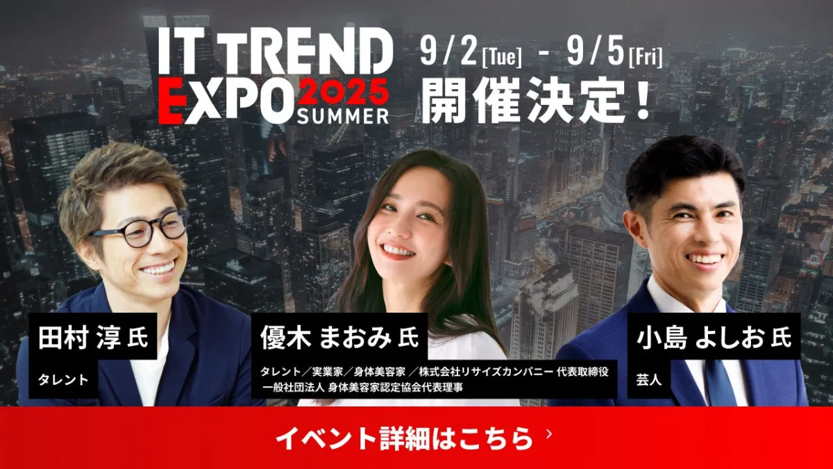 「ITトレンドEXPO2025 Summer」は、ただの展示会ではありません。新しいビジネスチャンスを見出す場であり、参加者のキャリアを刺激し、成長を促す貴重な機会となるでしょう。業界内外から集まる専門家たちと交流し、最前線の情報を得ることで、参加者それぞれのビジネスやキャリアに貢献するはずです。ぜひとも参加登録をして、この特別な機会をお見逃しなく!