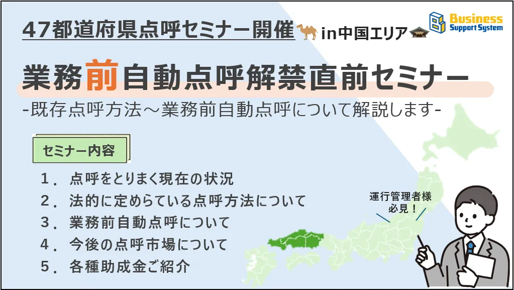 現在、業務前自動点呼が令和7年5月上旬に国交省から正式に公布される予定です。それに伴い、このセミナーでは点呼業務の最新情報に加え、異なる点呼方法(遠隔点呼、業務後自動点呼、IT点呼など)の要件、申請方法、さらには助成金情報についても触れていきます。そのため、ぜひご参加いただき、今後の業務向上に繋げてください。