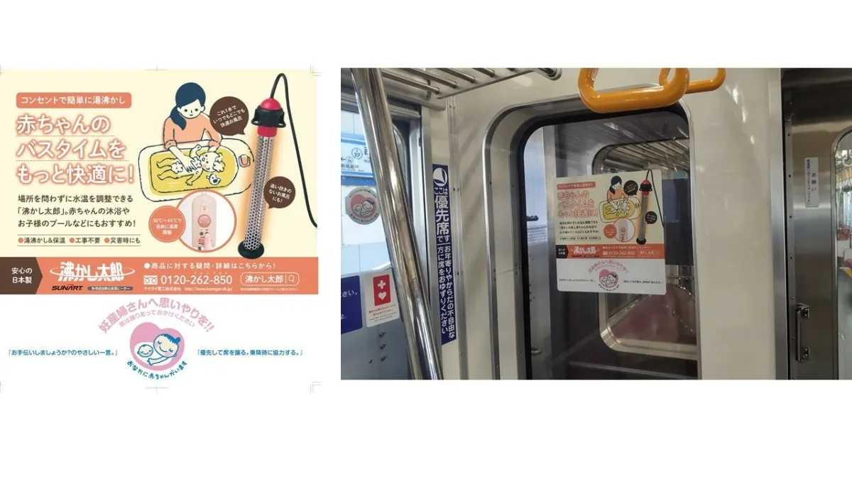 2022年3月4日より、都営地下鉄三田線の優先席エリア付近に、妊婦さんと赤ちゃんに優しいタイアップ広告が掲出されています。これは、育児に役立つ「沸かし太郎」とマタニティマークとのコラボレーションによるもので、交通機関の中で妊婦さんが特に利用の多い空間で配信されることで、周囲にその存在をアピールしやすくなるシステムです。