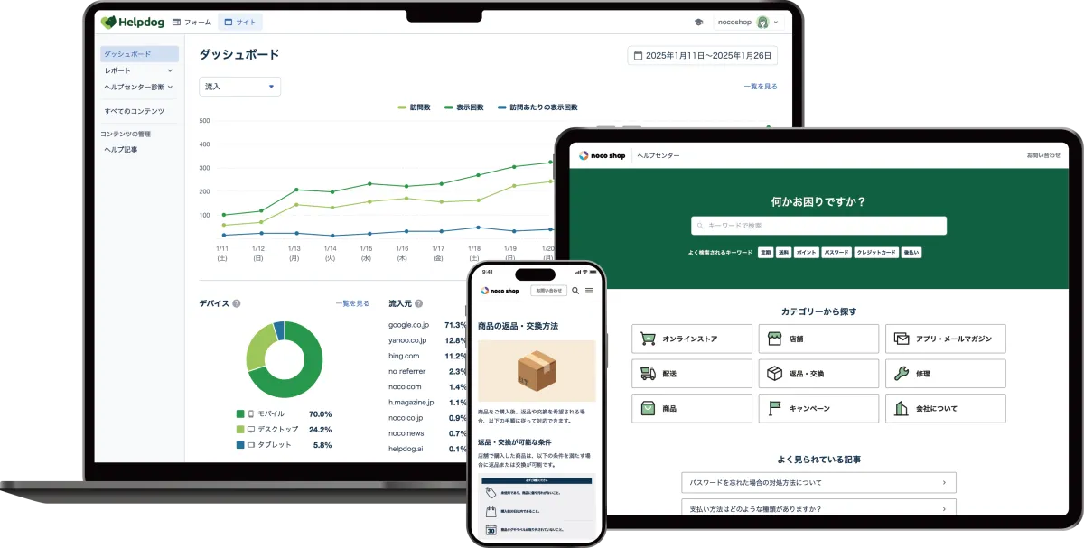 「ヘルプドッグ」は、顧客が知りたい情報にすぐアクセスできるよう、直感的な検索機能と使いやすいUIを提供します。このシステムは、企業が手間をかけずにサポート業務を効率化し、顧客満足度を向上させることに貢献しています。また、担当者は特別な専門知識がなくても、システムを継続的に運用・改善できる仕組みが用意されています。