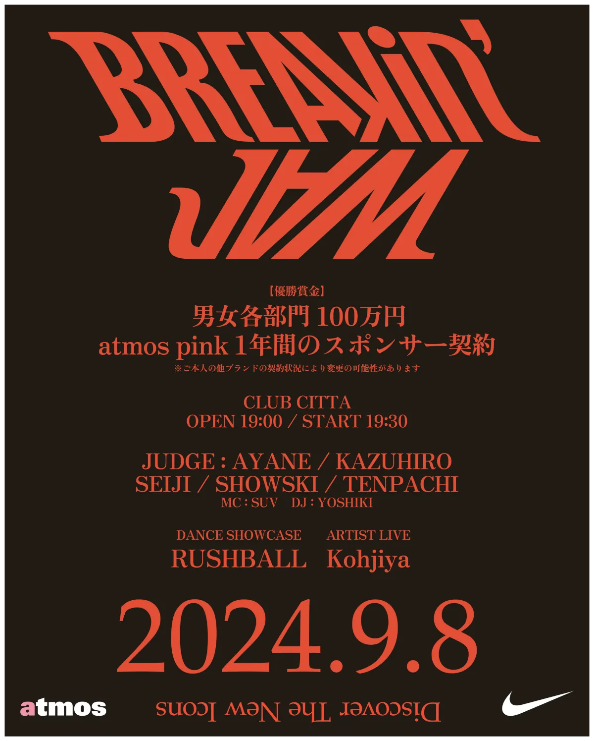2024年のスポーツの祭典で新競技として採用されるブレイキン。そのブレイキン競技に向けて、NIKEから初のブレイキン用シューズ「NIKE JAM」が7月16日(火)に発売されました。このシューズの発売を祝して、atmos pinkによる初のブレイキンバトル「BREAKIN’ JAM」が開催されることが決定しました。これは日本のブレイキン界に新しいアイコンを育成する目的で実施され、国内で3つの会場で予選が行われます。
