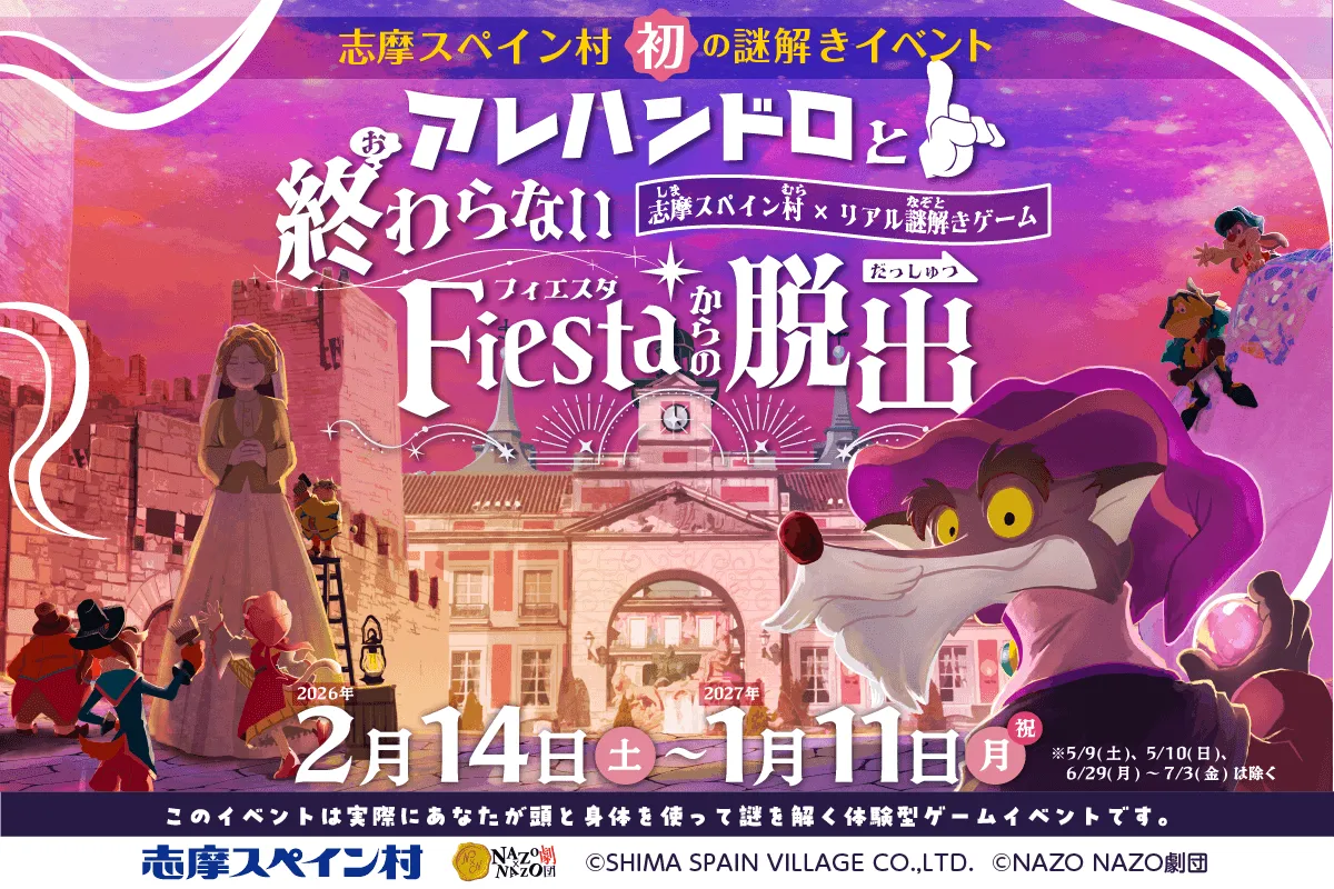 三重県志摩市にある志摩スペイン村が、2026年2月14日から2027年1月11日までの期間に、これまでにない体験型イベント「アレハンドロと終わらないフィエスタからの脱出」を開催します。このイベントは、志摩スペイン村内のテーマパーク、パルケエスパーニャを舞台に、訪れた人々がさまざまな謎解きに挑む周遊型のリアル謎解きゲームです。