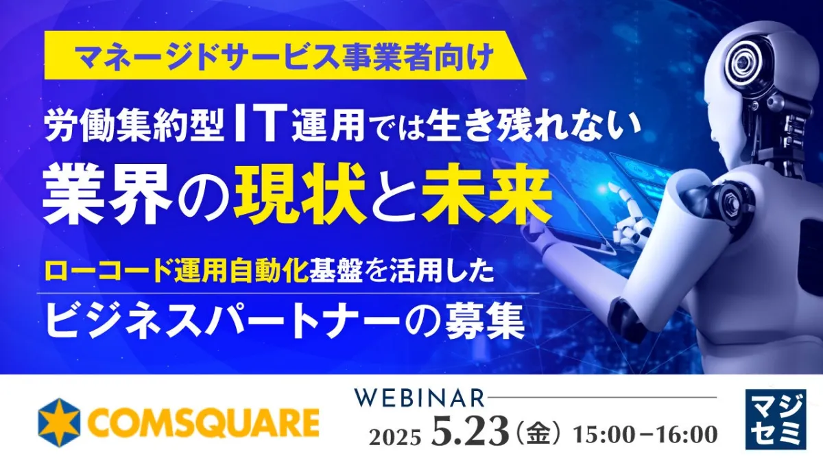 主催の株式会社コムスクエアと、協力の株式会社オープンソース活用研究所、マジセミ株式会社の連携で進められるこのセミナーは、IT運用サービス業界の現状を打破し、新たなビジネスモデルを探る貴重な機会です。
