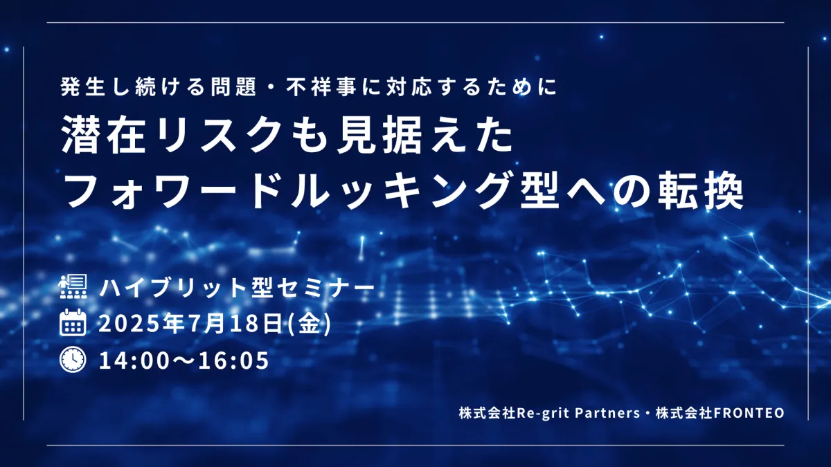 このセミナーでは、元日本郵政グループの最高コンプライアンス責任者(CCO)である早川真崇氏が、フォワードルッキング型リスクマネジメントの重要性とその具体的な手法について説明します。また、Re-grit PartnersのManaging Director、水戸貴之氏が、実装に際した障壁や組織内の誤解についても触れ、それらに対する解決策を提案します。さらに、FRONTEOの鹿田圭氏がAIの活用についてその実績と有用性を語ります。
