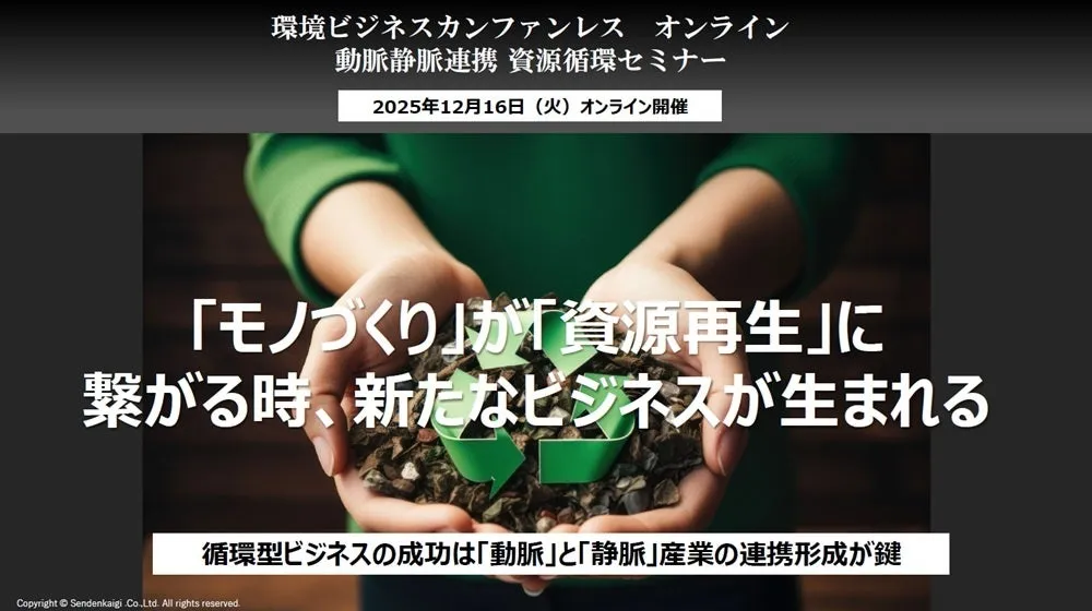環境問題が深刻化する現代において、循環型経済の重要性が増しています。2025年12月16日(火)、株式会社宣伝会議が主催する『環境ビジネス カンファレンス 動脈静脈連携 資源循環セミナー』がオンラインで開催されます。このセミナーでは、循環型ビジネスの鍵を握る「動脈(製造)」と「静脈(回収・再生)」の産業間の連携に焦点を当て、参加者に新たなビジネスチャンスを提供します。