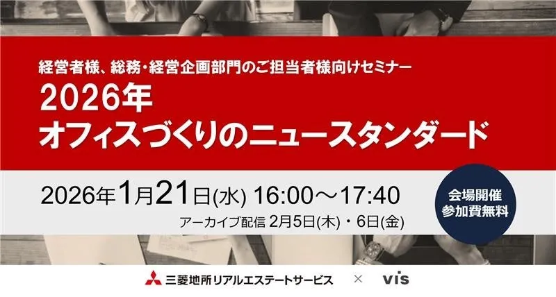 株式会社ヴィス(本社:東京都港区)は、三菱地所リアルエステートサービス株式会社(本社:東京都千代田区)と共催で、オフィス戦略に関するセミナー「2026年オフィスづくりのスタンダード」を開催します。このセミナーは、現在のオフィスマーケットのトレンドや、今後のオフィスデザインの戦略、さらには移転や再配置を検討する際の重要な判断ポイントについて専門家が解説する貴重な機会です。