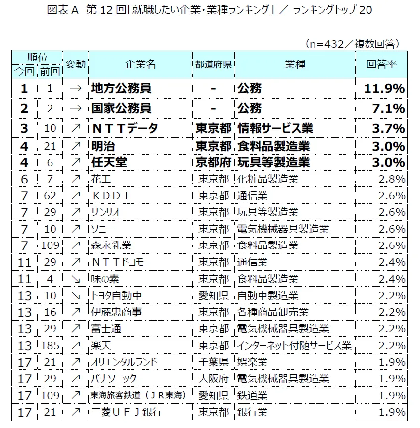 調査によれば、1位に選ばれたのは「地方公務員」で、回答率は11.9%でした。この結果は、安定した職業が求められていることを示しており、公務員人気が続いています。2位は「国家公務員」、3位は「NTTデータ」と続き、4位には「明治」と「任天堂」がランクインしました。ここで注目すべきは、トップ20までのすべての企業が国内企業で構成されている点です。
