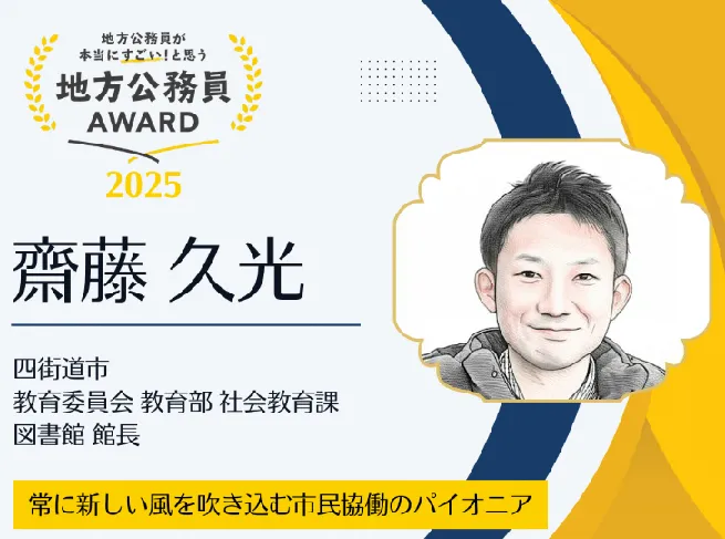 受賞者は四街道市教育部社会教育課の図書館長、齋藤久光さんです。彼は平成13年に四街道市に入庁し、これまでに総務課、スポーツ振興課、政策推進課など多岐にわたる業務を経験してきました。いまでは図書館長として、地域との連携を強化し、市民参加型の様々な施策を実施しています。