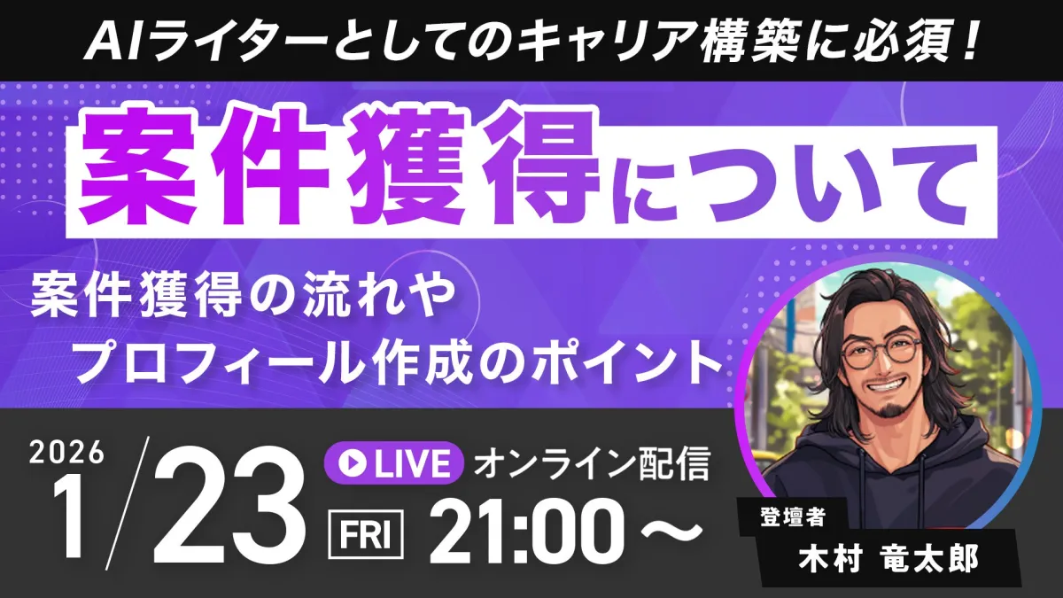 昨今、AI技術が進化する中で、ライティングの分野でもAIの活用が広がっています。しかし、技術が身についても「案件獲得」に苦しむライターが多いのが現実です。そんな方々をサポートすべく、1月23日(金)に開催されるウェビナー『AIライターとしてのキャリア構築に必須!案件獲得について』が注目されています。