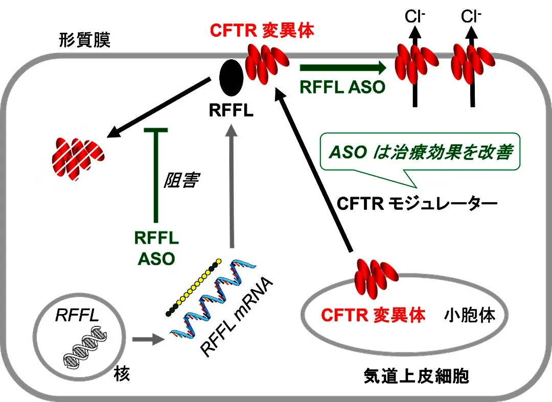 今回の研究成果は、特にRFFL(Ring Finger and FYVE-like domain containing E3 ubiquitin protein Ligase)というユビキチンリガーゼをターゲットとしたアンチセンス核酸(ASO)が鍵となっています。このASOは、既存のCFTRモジュレーターの効果を高めることが器の効果があることが確認されました。