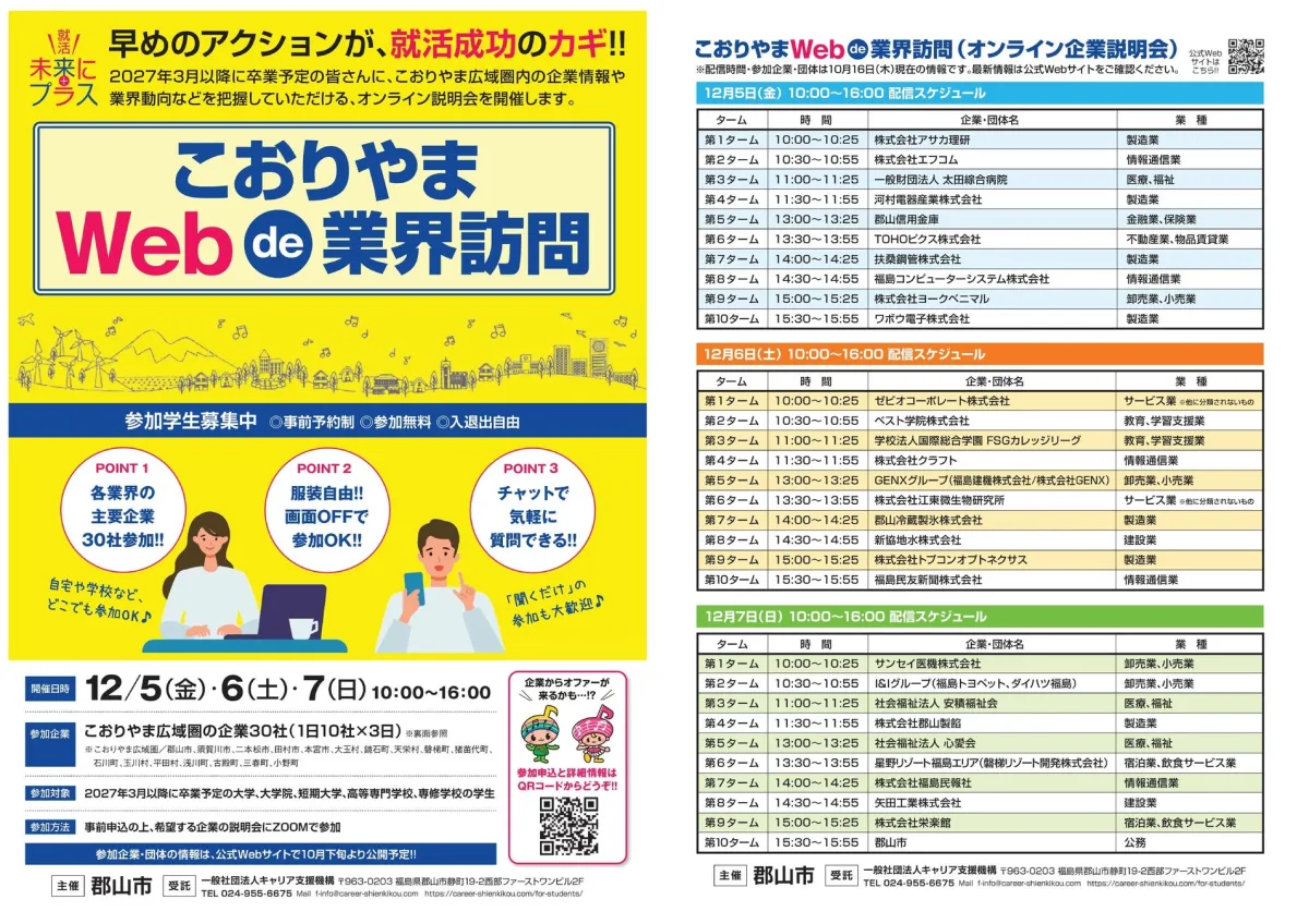 こおりやま広域圏に位置する企業からの出展が予定されており、地域発展にも貢献する行事です。この範囲には郡山市を含む5市、8町、4村があり、多様な分野から企業が参加します。企業の業種は、製造業、IT業界、サービス業など多岐にわたり、学生たちにとっては将来のキャリアの第一歩を探る上で絶好の機会となるでしょう。