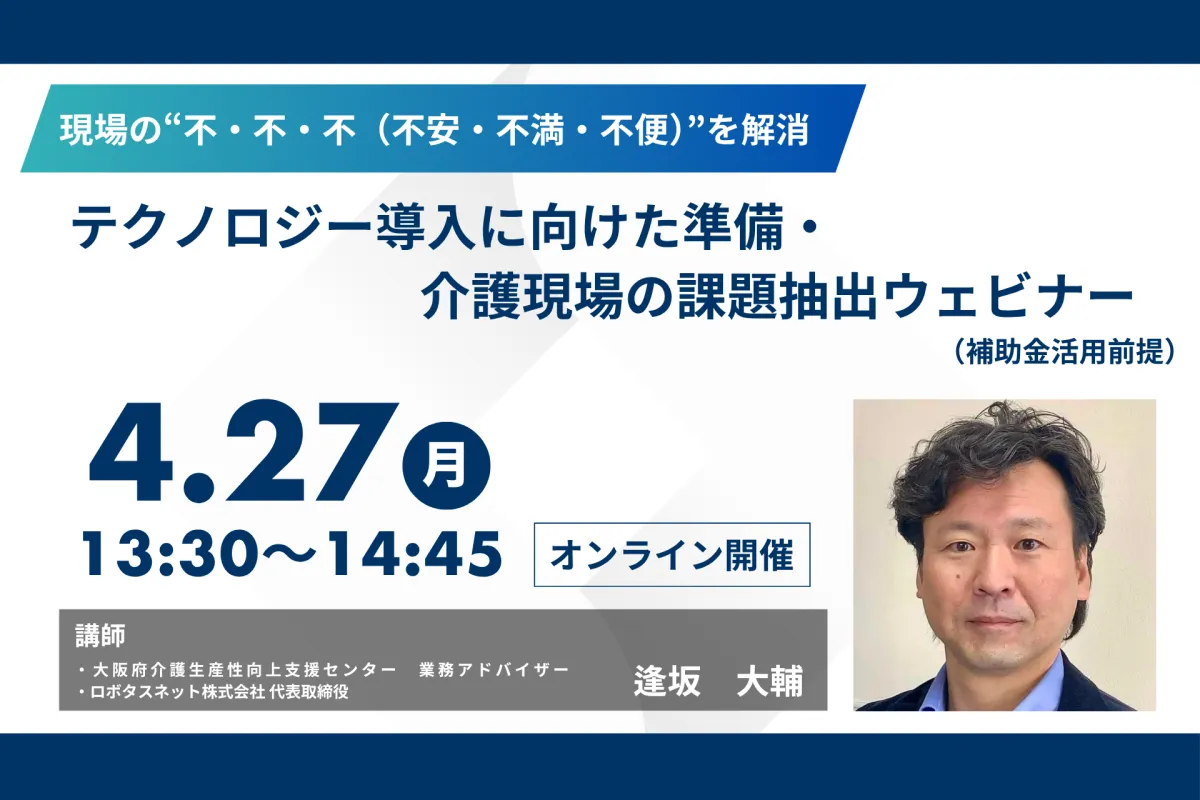本ウェビナーは、介護現場の実状にあった課題を正しく抽出し、適切なテクノロジーを選定・導入することを目的としています。業界での豊富な実績を持つロボタスネット株式会社の代表取締役、逢坂大輔氏が登壇し、具体的な支援事例をもとに、実践的な課題整理の手法を解説します。参加者は、現場で役立つワークシートも手に入れることができます。