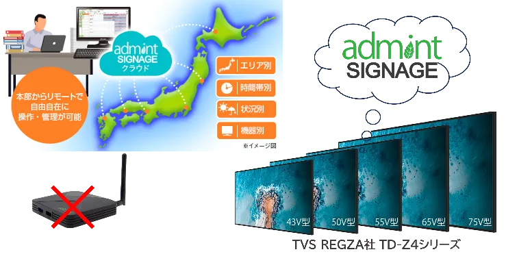「admintサイネージforレグザ」は、従来型のインターネット配信型デジタルサイネージと異なり、専用のSet Top Box(STB)が不要であるという点が最大の特徴です。この新しいシステムは、TVS REGZA社が提供するデジタルサイネージ用のレグザ(TD-Z4シリーズ)にSTB機能を内蔵しており、ユーザーはこれひとつで快適にサイネージの運用が可能です。