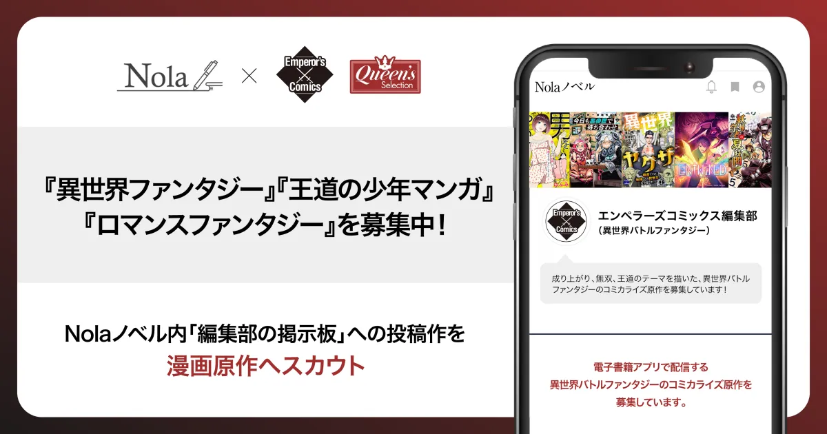 株式会社indentが、大洋図書とのコラボレーションによる新たな取り組みを発表しました。5月13日から、同社が運営する小説投稿サイト「Nolaノベル」において、「少年マンガ」、「異世界バトルファンタジー」、そして「ロマンスファンタジー」のジャンルで漫画原作のスカウトを始めます。これまでに50万人以上の作家が登録した「Nola」は、すべての作家に新たなチャンスを提供する場となっています。