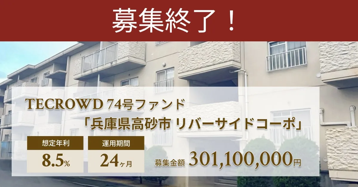 日本国内での不動産投資の新たな形として注目を集めている「TECROWD(テクラウド)」。このクラウドファンディングは株式会社TECRAが運営し、不動産特定共同事業法に則った仕組みで行われています。2025年1月21日からスタートした「兵庫県高砂市 リバーサイドコーポ」の74号ファンドは、多くの投資家に支えられており、全額お申込みを終えることができました。