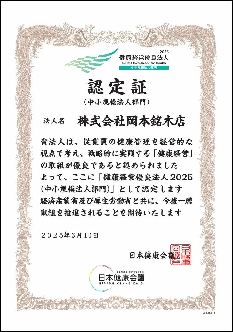 岡本銘木店が「健康経営優良法人2025」に初認定