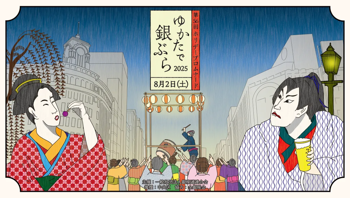 「ゆかたで銀ぶら2025」の開催日時は、2025年8月2日(土)の16時から20時30分までで、銀座通りの各商業施設および店舗が参加します。主催は一般社団法人銀座通連合会で、イベントに先立って街路灯にはフラッグが掲出されます(掲出期間:2025年7月21日〜8月2日)。