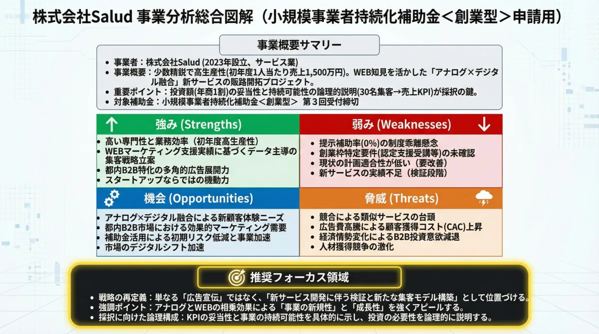 ただの事業分析ではなく、申請する補助金に対する企業の強みを最大限に活かすためのSWOT分析をAIが自動生成します。この特徴により、企業はより的確に補助金の魅力を把握し、自社の強みを活かした申請書を作成できます。