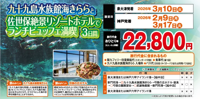 このツアーの販売は、2026年3月まで続き、価格はお一人様22,800円(税込)です。料金に含まれる内容は、阪九フェリー往復乗船代(スタンダード洋室)、食事代(昼1回)、九十九島水族館入場料、および当日のバス代です。また、専任の添乗員が同行するので、安心して旅行を楽しむことが可能です。