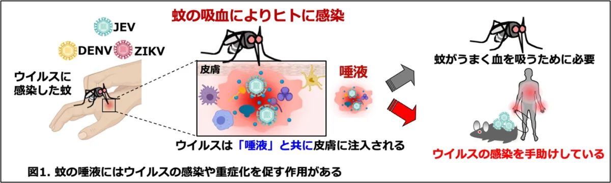 - - ウイルス感染の増強: 蚊の唾液には、デングウイルス(DENV)や日本脳炎ウイルス(JEV)などのフラビウイルスの感染を強化する成分が含まれていることが示されました。