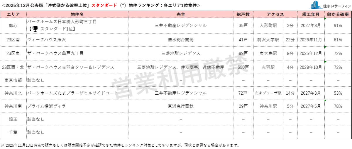 不動産市場の現状において、マンションの価格が高騰している昨今、消費者は資産性を重視した物件選びに注目しています。そんな中、スタイルアクト株式会社が運営する「住まいサーフィン」は、2025年12月版の「沖式儲かる確率」に基づく首都圏エリア別のマンションランキングを発表しました。このランキングは、過去の物件の含み益が出た割合を基に、資産性の保たれやすさを確率で示しています。