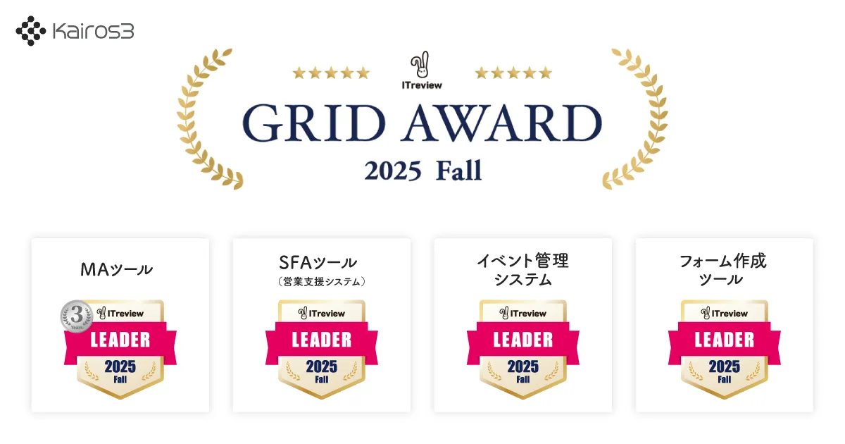 カイロスマーケティング株式会社が提供するMA+SFA一体型ツール「Kairos3」が、「ITreview Grid Award 2025 Fall」で最高位「Leader」を願い、特にMAツール部門で3年連続受賞という快挙を達成しました。これは、ビジネス向けのIT製品やクラウドサービスに関するレビューを基にしたもので、約146,000件のレビューが集まっています。