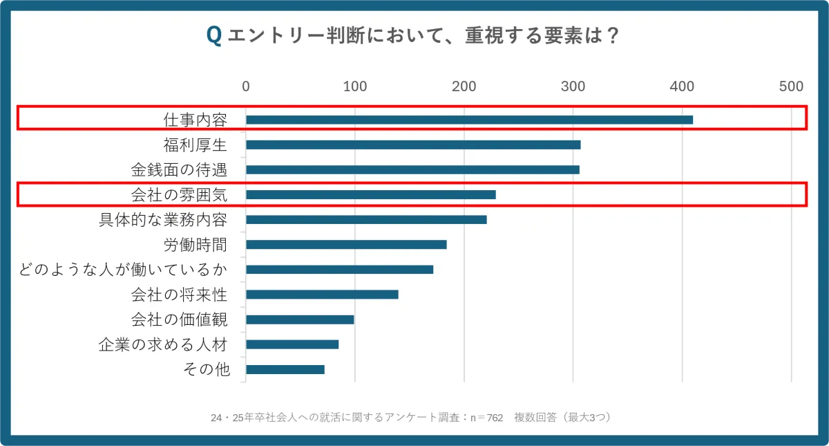 最近、for,Freelance株式会社が実施した調査によると、就活生がエントリーを判断する際に特に重視する要素は仕事の内容、給与、職場の雰囲気であることが明らかになりました。一方で、会社の将来性や理念といった情報は、あまり注目されていないことも判明しています。