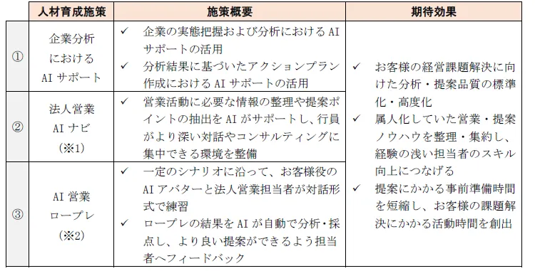 具体的には、以下の3つの施策を通じて法人営業担当者のスキル向上を図ります。