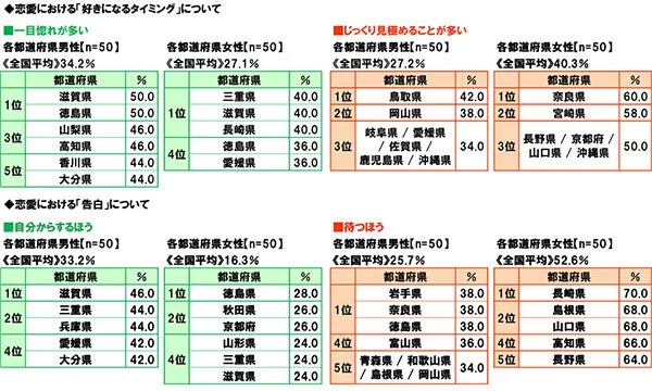 まず注目すべきは「一目惚れ」に関する結果です。男性では滋賀県と徳島県において各50%の人々が一目惚れを経験したと回答しており、双方の県が男性にとっての最大の「一目惚れ県」としてランクインしました。一方、女性では三重県、滋賀県、長崎県が同率で40.0%を記録し、一目惚れの傾向が見受けられました。これに対して、じっくりと恋愛を見極める傾向が強いのは鳥取県の男性(42.0%)と奈良県の女性(60.0%)とされています。