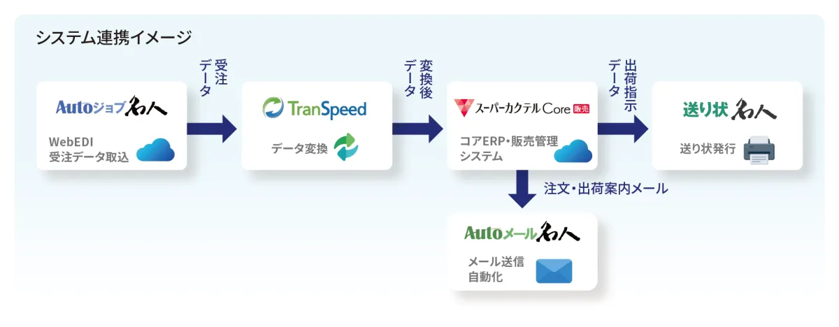 同社が導入したのは、ユーザックシステムの「名人シリーズ」。具体的には、受注処理の「Autoジョブ名人」、メール業務自動化の「Autoメール名人」、送り状発行の「送り状名人」、データ変換ツールの「TranSpeed」です。