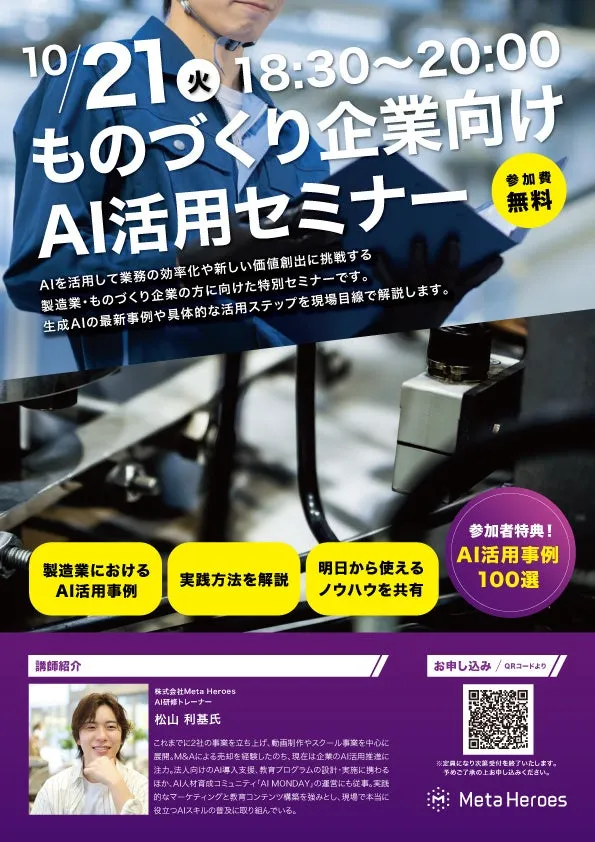 株式会社Meta Heroesは、ものづくり企業を対象にした「AI活用セミナー」を2025年10月21日(火)に開催します。ネットを使ったオンライン形式での無料セミナーです。このセミナーは、日本の製造業が直面しているさまざまな課題に対し、AIを利用した解決策を提供することを目的としています。