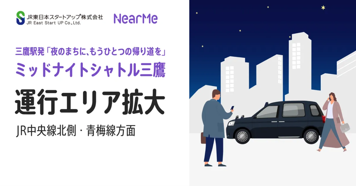 2025年、JR東日本系列のスタートアップであるJR東日本スタートアップ株式会社と、移動に関する課題解決に取り組む株式会社NearMeが共同で発表した『ミッドナイトシャトル三鷹』の運行エリア拡大。これにより、終電後の帰宅がさらに便利に、安心して行えることが期待されています。