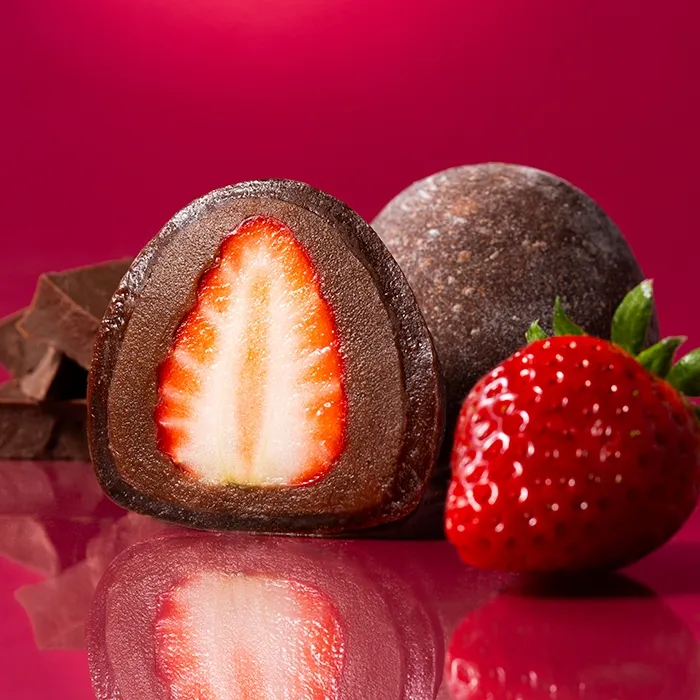 『ショコラ苺大福』に使用される「紅ほっぺ」は、見た目も美しく、果実の甘さと酸味のバランスが絶妙です。この苺を使用することで、ショコラのビター感と絶妙にマッチし、口の中で広がる食感と風味を楽しむことができるのです。