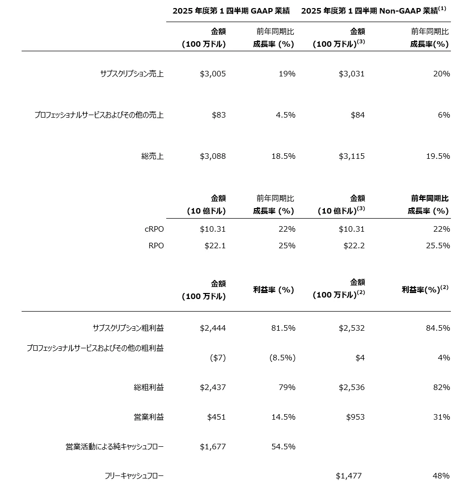 特に注目すべきは、2025年度第1四半期のサブスクリプション売上が3005億ドルに達し、前年同期比で19%の増加を記録した点です。為替変動の影響を除外した場合、この数字は20%にまで達します。総売上は3088億ドルで、前年同期比で18.5%の増加、これも為替の影響を排除すると19.5%に達します。