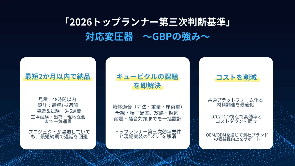 GBPは、こうした問題を的確に把握し、トップランナー第三次判断基準に基づいた前倒し設計と実装の同時推進により、納期短縮とコスト削減、そして製品信頼性を兼ね備えたソリューションを提供します。
