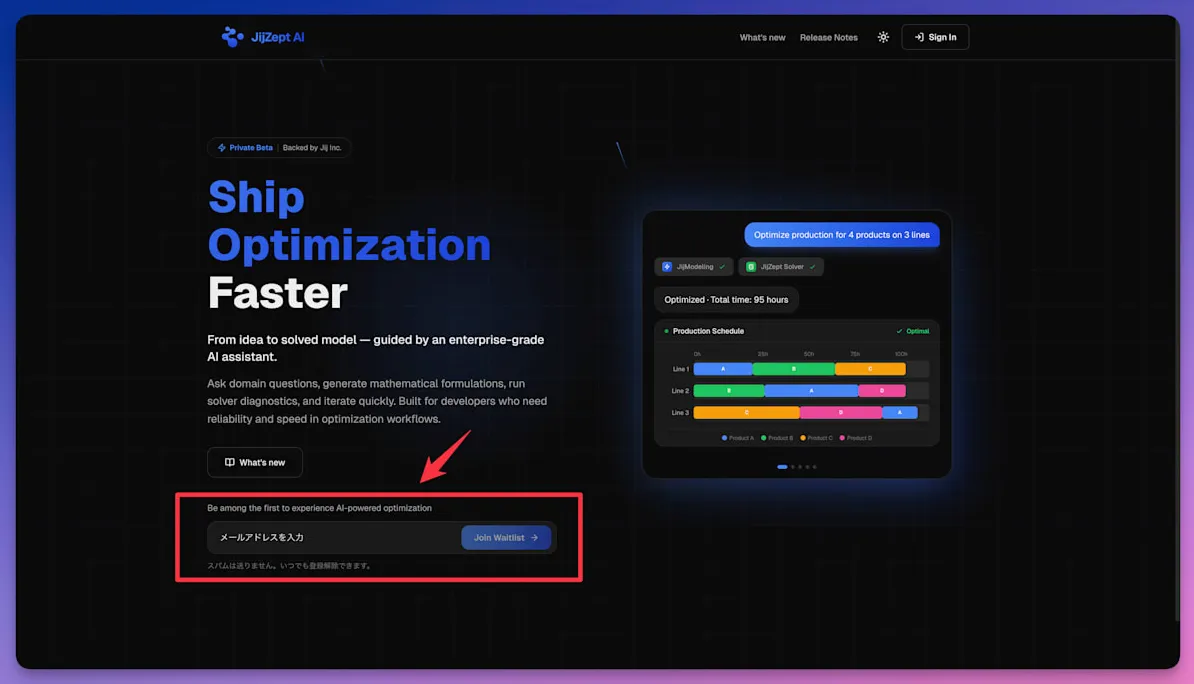 株式会社Jijが提供する数理最適化AIアシスタント「JijZept AI」のβ版が、今日から招待制で公開されました。これにより、エンジニアやデータサイエンティストが数理最適化を手軽に活用できる環境が整います。