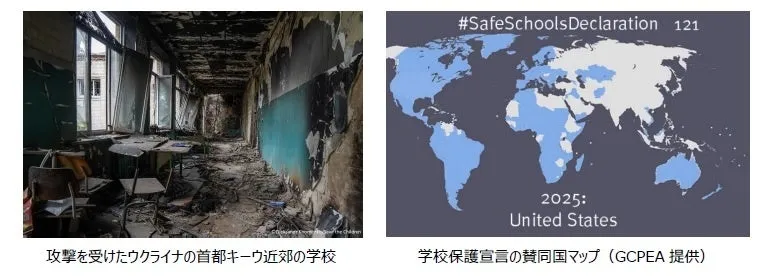 現在、世界には約4億7,300万人の子どもが紛争地域で暮らしており、その中で教育は深刻な危機に瀕しています。教育への攻撃は頻発し、学校や大学が攻撃の対象となることが多く、約2億3,400万人もの子どもたちが学ぶ機会を奪われています。このような状況を受けて、2015年には「学校保護宣言」が策定されました。この宣言は、教育を受ける権利を守り、学校が軍事目的で利用されることを防ぐための重要な文書です。残念ながら、日本はG7の中で唯一、まだこの宣言に賛同していません。