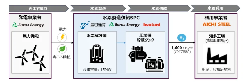 本事業では、愛知製鋼知多工場に水電解装置が設置され、電気分解によって水素を製造します。この装置は、トヨタ自動車が製造したスタックを使用し、千代田化工建設が提供するものです。ユーラスエナジーが所有する風力発電所の電力を活用し、オンサイトでの低炭素水素の製造を実現します。