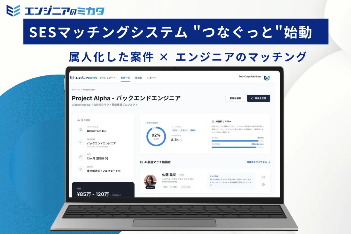 今回のシステム開発にあたり、SESのマッチングは「人」の感覚に依存する部分が大きかったことが課題でした。このシステムにより、培った知見をもとにエンジニアと案件のベストマッチングを実現することを目指しています。テクノロジーを活用して、エンジニアが自信を持ってキャリアを築ける環境を支えていきます。