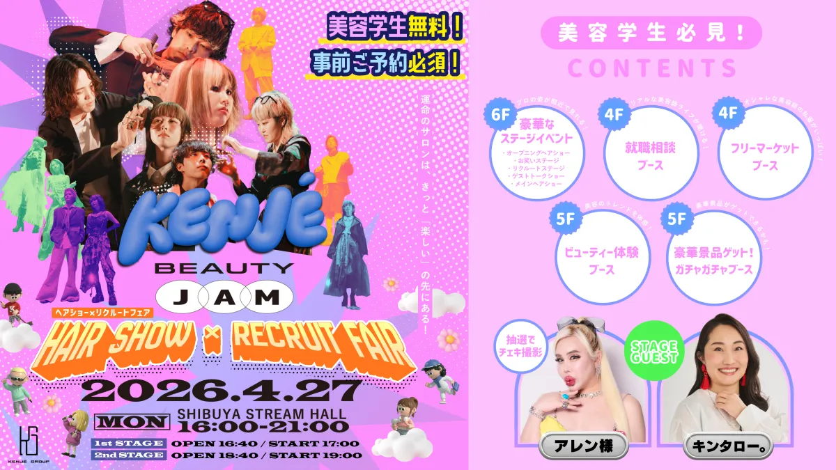 2026年4月27日、渋谷のストリームホールにて美容学生向けの就職フェア「KENJE BEAUTY JAM」が開催されます。このイベントは、美容業界を志す学生たちに向けて開催されるもので、昨年から続くものであり、今度で3回目となります。参加者は美容学生や美容学校の教員に限り、入場は無料です。予約制で、先着順となります。