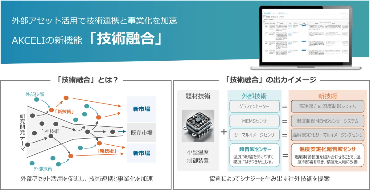 2025年6月30日、早くも注目されるAIサービス「AKCELI」に新機能「技術融合」が追加される。企業のイノベーション活動をサポートするナインシグマ・ホールディングス株式会社(本社:東京都千代田区、代表取締役社長:諏訪 暁彦)は、今回の機能追加により、自社が保有する技術や商材に外部の技術を掛け合わせ、新たなアイデアを生成する手助けを行う。