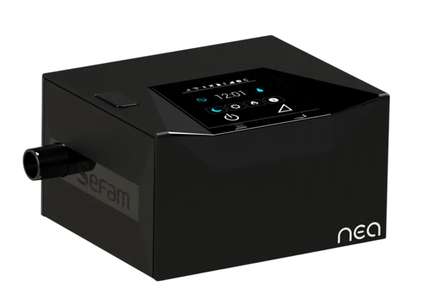 これまで多くのメーカーが音の軽減に試行錯誤してきたのは事実ですが、防音材の劣化による健康への影響という新たな課題も抱えていました。「Nea」は、SEFAM社が6年間の研究開発を重ねた「Nealveole(TM)」技術を採用することで、防音材を必要とせず、24.5dBAの静音性を実現しています。この静音性は、患者の快適な睡眠環境を提供するための大きな一歩です。また、自社開発の特殊S字形羽根付きブロワーによって、最大190LPM以上の流量を誇り、患者の自然な呼吸にぴったりと合致するように設計されています。
