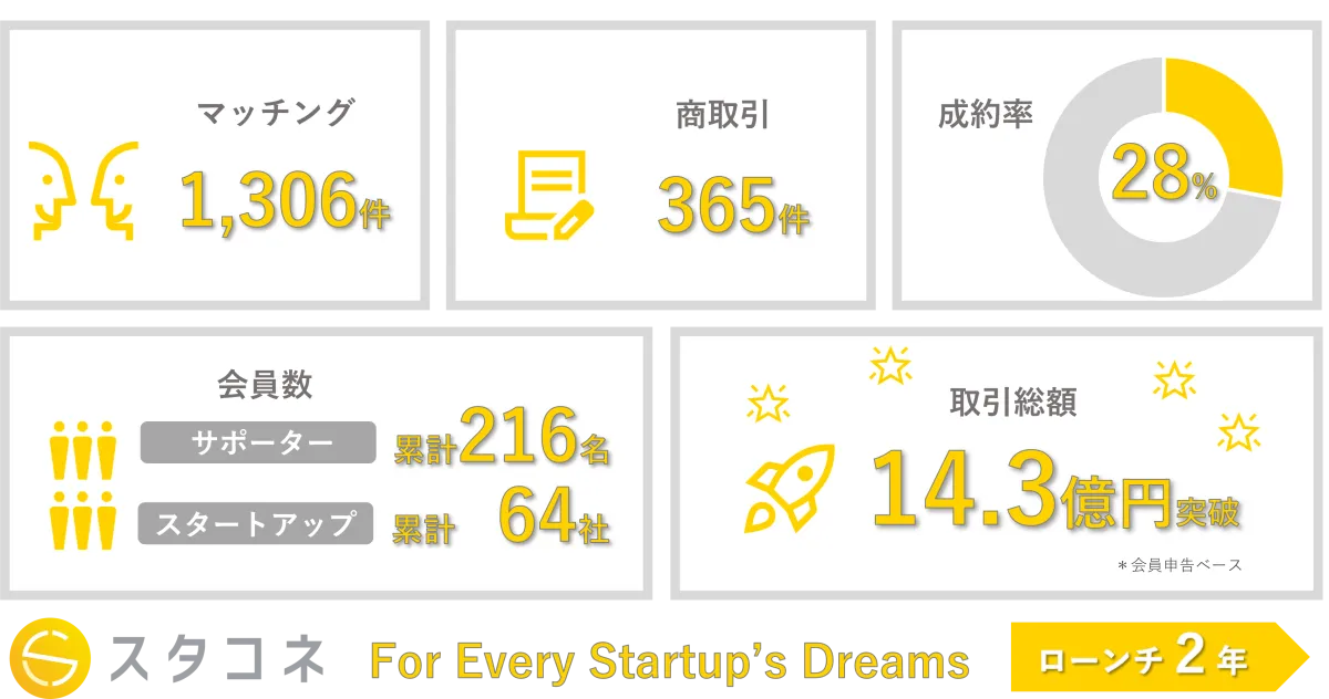 サービス開始からの約2年間で、スタコネは約28%のマッチングが商取引に繋がっており、具体的には367件の商取引(取引、提携、出資等)が成立しています。この数字は、スタコネが信頼性の高いネットワーキングの機会を提供し、実現可能なビジネスチャンスを生み出している証です。会社側は、この成功を基にさらなる成長に繋げるため、会員間のつながりを深める活動を続けています。