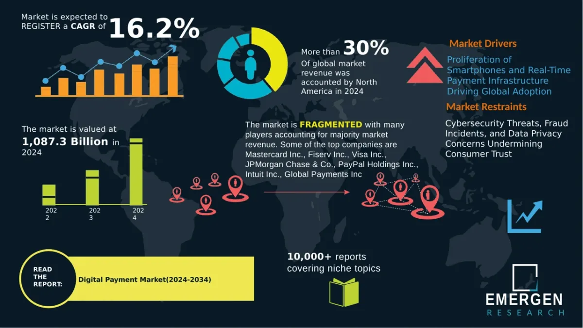 世界のデジタル決済市場は、2024年には1兆900億米ドル、2034年には4兆9200億米ドルに達する見込みで、年平均成長率は16.2%と予測されています。それに伴い、日本も地域のイノベーションリーダーとして急速な成長を遂げています。