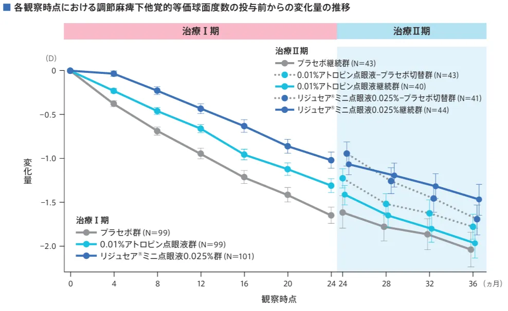 まず、リジュセアミニ(低濃度アトロピン)による治療です。この薬剤はアトロピン0.025%を含み、強膜のムスカリン受容体に作用し、眼軸長の進展を抑制することで近視の進行を抑える効果が期待されています。治療対象は主に5歳から15歳(場合により3歳から18歳も)で、点眼薬は防腐剤フリーでの長期間の使用が可能です。治療にかかる費用は3,800円(税込)で、初診検査診察料が3,000円、再診が1,000円必要です。定期的な診察は毎月から3ヶ月ごとに行う必要があります。