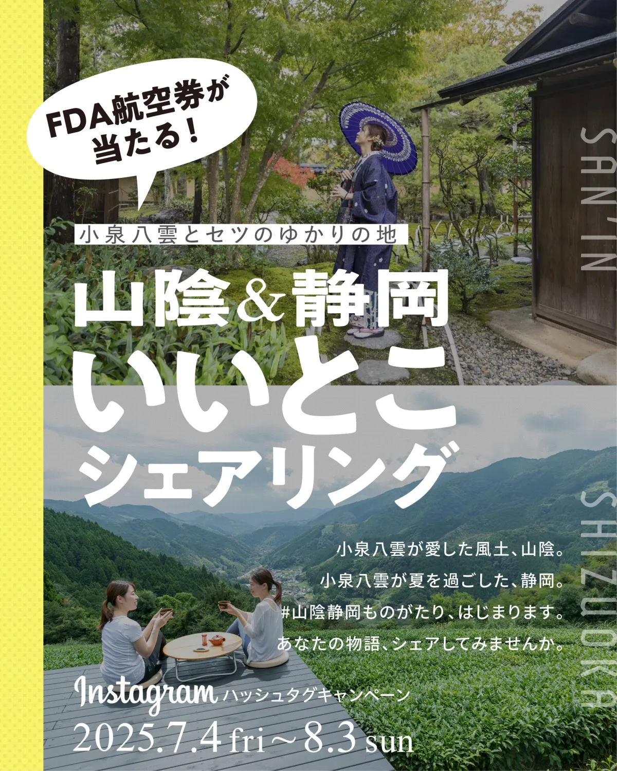 このキャンペーンは、小泉八雲とその妻セツにゆかりのある地域で行われます。山陰と静岡を結ぶこの施策は、両地の魅力をハッシュタグ「#山陰静岡ものがたり」で広めることを目的としています。具体的には、参加するには対象エリアで撮影した写真をInstagramに投稿するだけ。応募期間は第1回が2025年7月4日から8月3日、第2回が9月5日から10月5日間です。