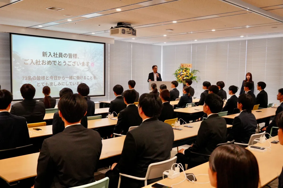 入社式の中では、社長からの訓示に加えて、取締役からの祝辞もありました。参加者たちは、自らの社会人生活のスタートを感じる一日となりました。新入社員たちは今後、営業職の場合約2ヶ月、エンジニア職は約8ヶ月の研修を経て各部署に配属される予定です。