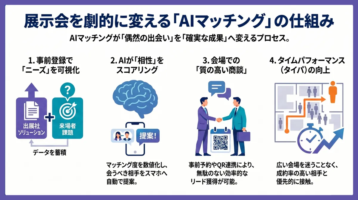 このサービス特有の機能として、來場者の関心と行動データをもとに出展企業とのマッチングが行えるAI機能があります。この機能により、「偶然の出会い」に依存するのではなく、データに基づいた商談機会を生み出すことが可能になります。