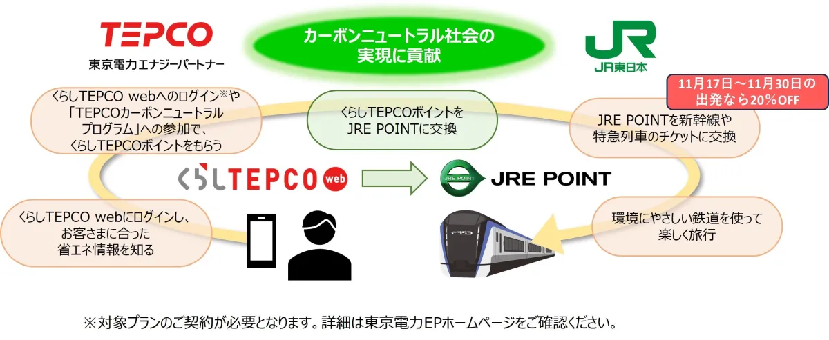 JR東日本と東京電力エナジーパートナーは、環境に配慮した交通手段を利用するための新たな試みとして、2025年9月17日から、東京電力EPの「くらしTEPCOポイント」をJR東日本の「JRE POINT」に交換できるサービスをスタートします。このサービスは、電気やガスの使用状況を確認できる「くらしTEPCO web」会員と「JRE POINT」会員の方々が利用可能です。